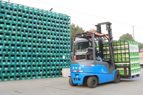 新能源叉車配置的磷酸鐵鋰電池,具有安全、環(huán)保的特性,且零排放、無污染,在保障生產(chǎn)環(huán)境安全作業(yè)的同時,為廠區(qū)原材料食品安全筑起防護墻,嚴(yán)格杜絕了原材料在搬運過程中遭受二次污染的可能。同時比亞迪鋰電池叉車性能可靠、動力強勁、隨充隨用、壽命長,可充分滿足啤酒企業(yè)高負(fù)荷運轉(zhuǎn)需求。